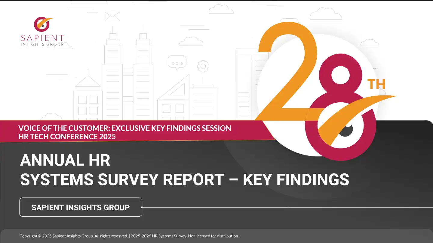 This presentation delivers exclusive findings from the 2025–2026 Annual HR Systems Survey Report – Key Findings, presented at the HR Technology Conference and based on Sapient Insights Group’s 28th year of independent research.
