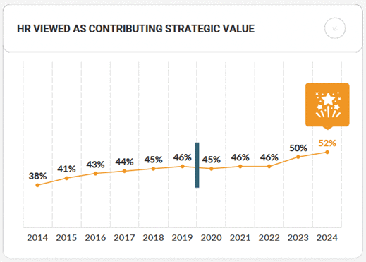 On one hand, HR professionals have self-reported that they’re “viewed as contributing strategic value” in greater numbers than ever. According to our 27th Annual HR Systems Survey Report, 52% of HR professionals believe they are playing a much more central and strategic role in the business and that focusing on outcome-oriented HR functions is driving that change.