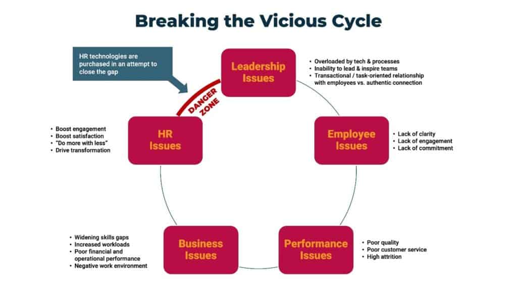 Since so many of these challenges are rooted in employee issues, HR teams are naturally, viewed as the appropriate internal resource to get things back on track. But pressure is high, and HR teams are often understaffed, so HR turns to technology vendors to help automate tasks, improve scale, and streamline operations… which creates greater pressure on leadership, and the cycle begins again.