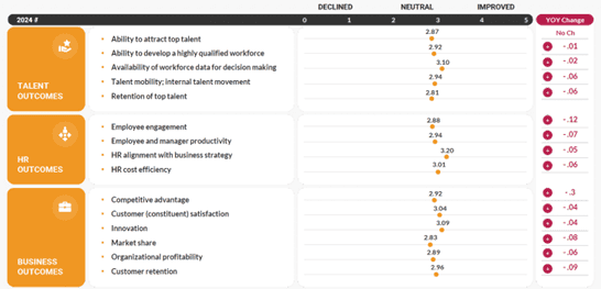 On the other hand, that same research report indicates that during the past 12 months, outcomes have declined across each core category we track: Talent Outcomes, HR Outcomes, and Business Outcomes. (See the illustration below.)