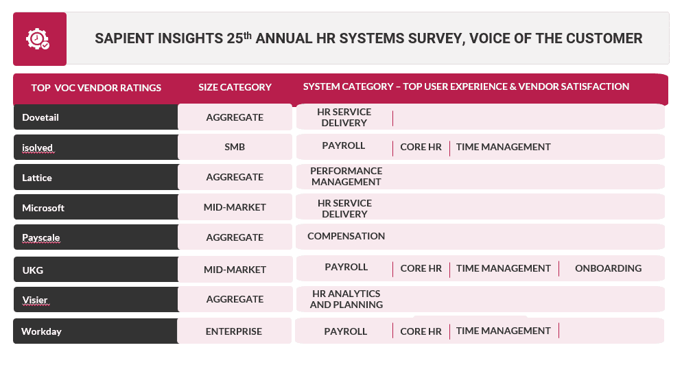 It is an honor to share the feedback we receive annually with the community, but I’ll admit sharing positive feedback is always more enjoyable! This year Sapient Insights Annual HR Systems Survey White Paper, 25th Edition highlights 38 vendors, who achieved Top Five customer ratings status in 10 major HR system categories. Only eight vendors achieved the highest customer ratings in both User Experience and Vendor Satisfaction in their various categories and/or size segments, a real accomplishment. To celebrate these achievements in our 25th year, we are launching a series of Voice of the Customer badges to underscore these phenomenal achievements.