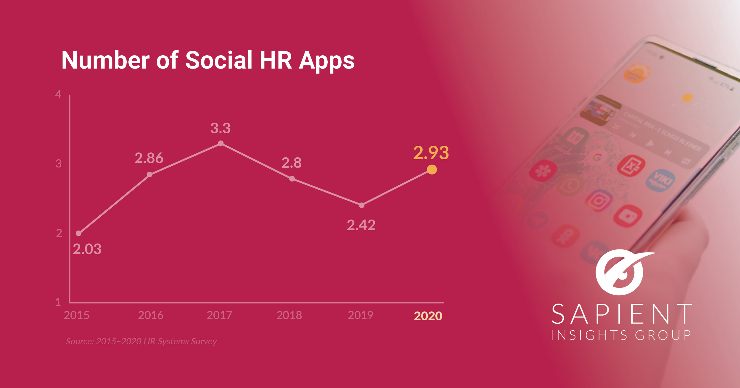 The number of Social Applications used strategically for HR peaked in 2017 and has since been trending back down. For a while, HR teams were experimenting with different social applications, eventually settling on a few that met their needs for communication, recruiting, or branding. We continue to see this story evolve as we look at the numbers for 2020. We anticipated there would be an increase as organizations ramped up their work-from-home strategies to keep the lines of communications open with all employees as well as customers.